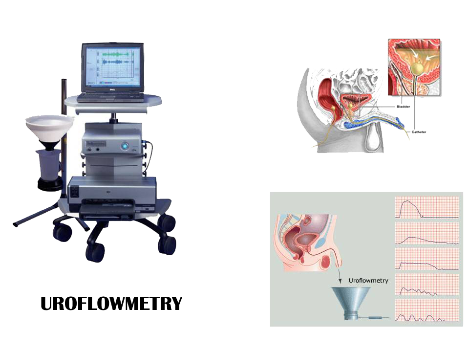 Uroflowmetry measures the urine volume released from the body and the speed with which the urine is released, and how much time it takes to release. This test is used for diagnosing LUTS like incomplete emptying, weak stream, straining, hesitancy, frequency, and post-void dribbling.